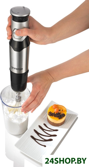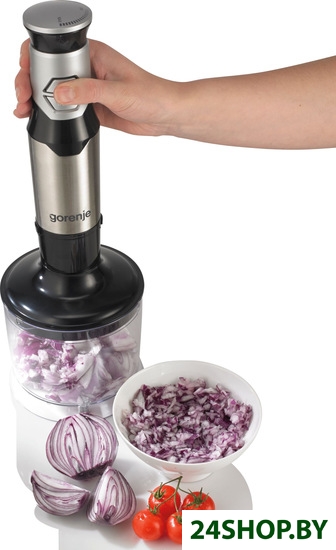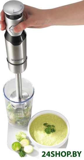 Наличие в комплекте погружного блендера измельчителя. Он представляет собой емкость с крышкой, на дне которой фиксируется один конец оси ножа. В крышке расположено гнездо, которое закрепляется в ручке блендера, где находится мотор (стандартную насадку при этом необходимо снять). Измельчитель по сути является уменьшенной копией чаши кухонного комбайна. В нем можно измельчать разнообразные продукты, смешивать блинное тесто, соусы и детское питание, пюре, готовить паштетный фарш и т. д.