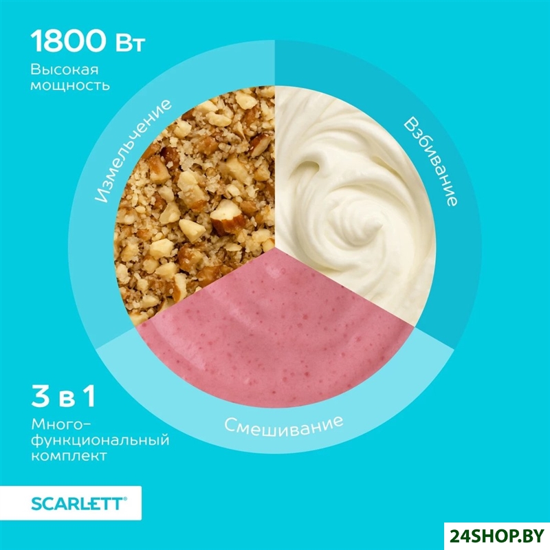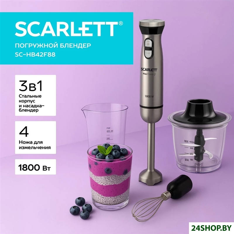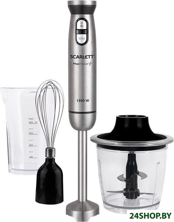 - Комплектация: блендер, мини-измельчитель 0.4 л, венчик для взбивания, мерный стакан 0.4 л, инструкция