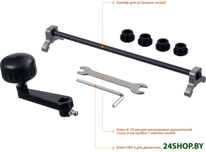 - Комплект поставки: - Станок;- Опора резиновая - 4 шт;- Калибр для установки ножей;- Ключ HEX 4 (для снятия кожуха стружкоотвода);- Ключ гаечный 8-10 (для фиксации ножей и регулировки положенияоткидных столов);- Рукоятка;- Руководство по эксплуатации.