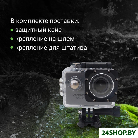 - Комплект поставки: - Экшн-камера DiCam 180- Водонепроницаемый бокс- Основное крепление- Крепление на руль велосипеда- Крепление на шлем- Адаптер-переходник- Адаптер на резьбу- Рамка- Повязка-бандаж- Батарея- USB-кабель- Двусторонний скотч- Руководство пользователя
