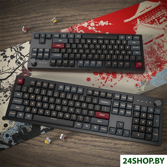 - Комплект поставки: два набора колпачков клавиш с тематикой замка Осаки (по 4 штуки в каждом наборе)пылезащитный чехолкабель USB-Cсъемник колпачков клавишсъемник переключателей