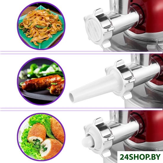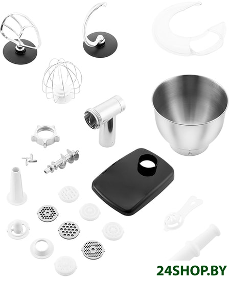 - Полная комплектация: венчик для взбиваниянасадка для смешиваниякрюк для замеса тестасепаратор для яицтри решетки для мясорубкинасадка для колбаснасадка-кеббенасадка для лапши - 4 шт