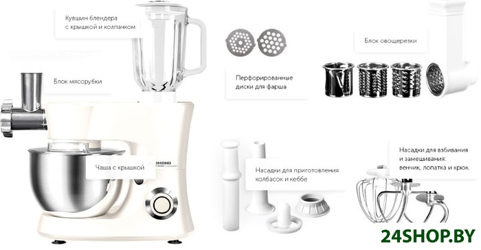- Функции: мясорубка, блендер, взбивание, смешивание, замешивание дрожжевого теста, терка, шинковка, ломтерезка