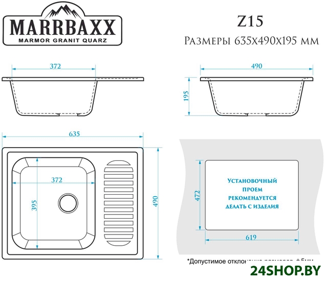 - Ширина мойки: 63.5 см