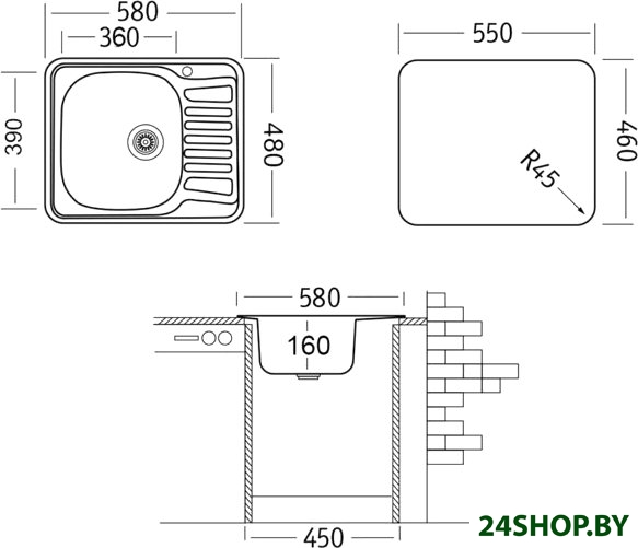 - Ширина мойки: 58 см