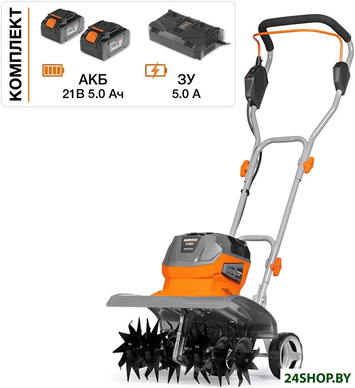 - Комплект поставки: - Два аккумулятора 21 В 5.0 Ач- Сдвоенное зарядное устройство- Шесть фрез (60 ножей)- Регулируемые транспортировочные колёса- Металлический корпус редуктора- Инструкция