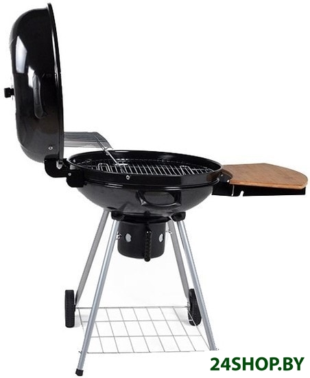 - 2) Гриль как приспособление по принципу действия и получаемому результату сходен с мангалом, но имеет более сложную конструкцию: обычно это глубокая емкость, часто круглой формы, с установленной внутри решеткой и закрывающаяся крышкой. Во многих моделях предусмотрена регулировка высоты решетки и притока воздуха, имеется смотровое окно и термометр, пристолья, шкафчики для принадлежностей и посуды и многое другое.