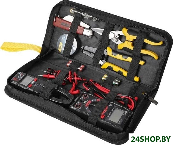 - Комплектация: мультиметр;токовые клещи;индикаторная отвертка;стриппер;ножницы;нож;изолента;батарейки.