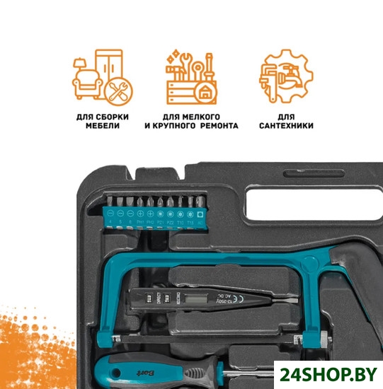 - Комплектация: Головки 1/4" (9 шт)Нож (1 шт)Отвертка часовая (6 шт)Отвертка (2 шт)Держатель для бит 170 мм с трещеткой (1 шт)Ножовка по металлу (1 шт)Отвертка-тестер (1 шт)Биты (10 шт)Плоскогубцы (1 шт)Длинногубцы 160мм (1 шт)Ключ разводной (1 шт)Клещи переставные (1 шт)Рулетка измерительная 3м (1 шт)Молоток (1 шт)Фонарик (1 шт)Изолента (1 шт)Кейс (1 шт)