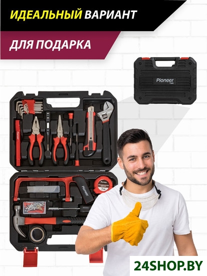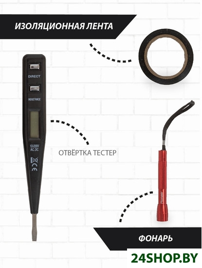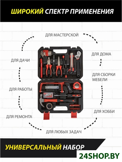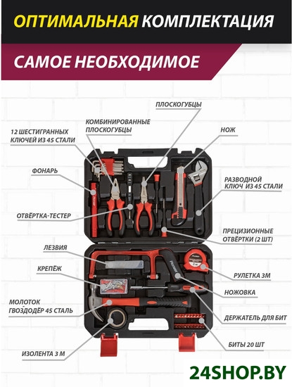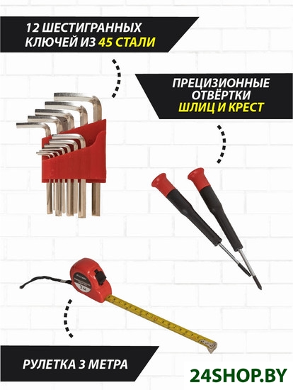 - Комплектация: Нож канцелярский1 шт.Биты20 шт.Держатель для бит1 шт.Прецизионные отвертки2 шт. (шлиц, крест)Отвёртка-тестер1 шт.Рулетка1 шт. (3 м.)Лезвия для ножа10 шт.Разводной ключ 8"1 шт.Молоток-гвоздодёр1 шт.Плоскогубцы 6"1 шт.Комбинированные плоскогубцы 6"1 шт.Изолента1 шт.Шестигранные ключи12 шт. (0,9-1,27-1,5-2-2,5-3-3,5-4-4,5-5-5,5-6)Набор крепежей80 шт.Ножовка 6"1 шт.Фонарь1 шт.Кейс1 шт.