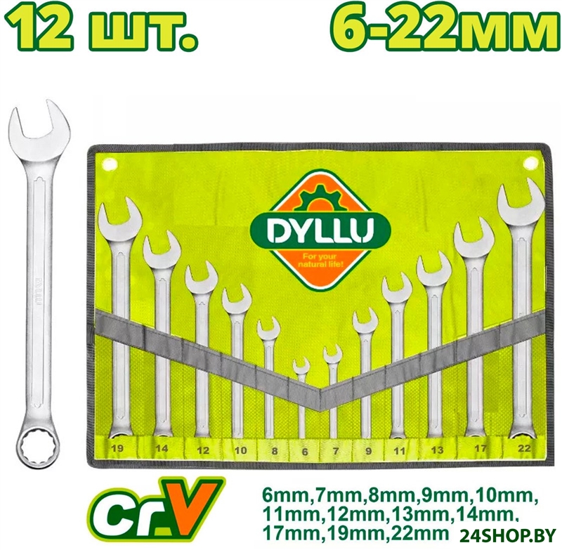 - Комплектация: Комбинированный ключ (6, 7, 8, 9, 10, 11, 12, 13, 14, 17, 19, 22 мм) - 12 шт.