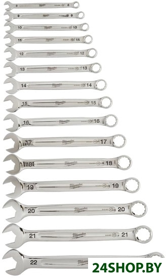 - Комплектация: Набор комбинированных ключей 8, 9, 10, 11, 12, 13, 14, 15, 17, 18, 19, 20, 21, 22 мм