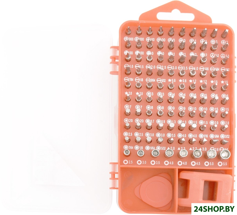 - Комплектация: 1x рукоятка1x удлиннитель1x короткая вставка1x пинцет1x магнит1x присоска2x пластиковая плоская отвертка1x игла1x треугольный инструмент8x гаечные головки: M2.5, M3, M4, M4.5, M5, M5.590x биты для мини-отвертки:Phillips: PH000, PH00, PH0, PH1, PH2 (2 шт. каждой)Pozi: PZ00, PZ0, PZ1, PZ2 (2 шт. каждой)Плоские: 1.0, 1.5, 2.0, 2.5, 3.0, 3.5, 4.0Плоские: 1/16, 5/64, 3/32, 7/64, 1/8, 9/64, 5/32Звезда: 0.8, 1.2, 1.5, 2.0 (2 шт. каждой)Торкс: T3, T4, T5, T6, T7, T8, T9, T10, T15, T20 (2 шт. каждой)Шестигранник: 0.7 (1x), 0.9 (1x), 1.3, 1.5, 2.0, 2.5, 3.0, 3.5(1x), 4.0 (2 шт. каждой)Шестигранник: 1/16, 5/64, 3/32, 7/64, 1/8, 9/64, 5/32Треугольник: 2.0, 2.3, 2.7, 3.0H-форма: 2.6 (2x)Y-форма: 2.0, 3.0