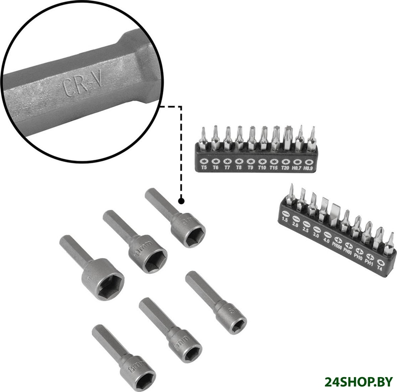 - Биты (насадки-отвертки): 48 (Hex, Torx, Phillips, Slotted)