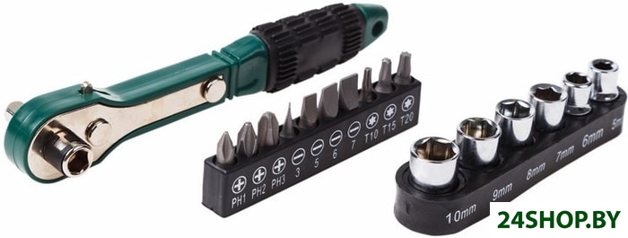 - Комплектация: Ключ трещоткаБиты: SL3, SL5, SL6, SL7, T10, T15, T20, PH1, PH2, PH3Торцевые головки: 5, 6, 7, 8, 9, 10