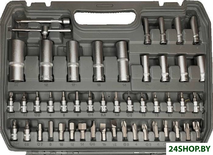 - Комплектация: Головки торцевые 6 граней ½: 10-32 ммГоловки удлиненные ½: 14-22 ммГоловки торцевые TORX ½: E10-24Биты (30 мм L) – HEX: 7-14 мм, SL8-10-12, PH3-4, PZ3-4, T40-60Свечные головки ½: 16 и 21 ммТрещотка ½: 72 зубаУдлинители ½: 125 и 250 ммАдаптер 3 wayАдаптер для бит ½Головки торцевые 6 граней ¼: 4-14 ммГоловки удлиненные 6 граней ¼: 6-13 ммГоловки торцевые TORX ¼: E4-8Биты ¼: SL4-6.5, T8-30. PH1-2, PZ1-2, HEX:3,4,5,6Трещотка ¼: 72 зубаОтвертка-держатель ¼: для битУдлинители ¼: 50 и 100 ммКарданы шарнирные ¼ и ½Вороток ¼Соединитель ¼* ¼Адаптер для битКлючи шестигранные Г-образные: 1,5-2,5 мм