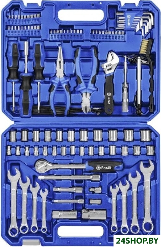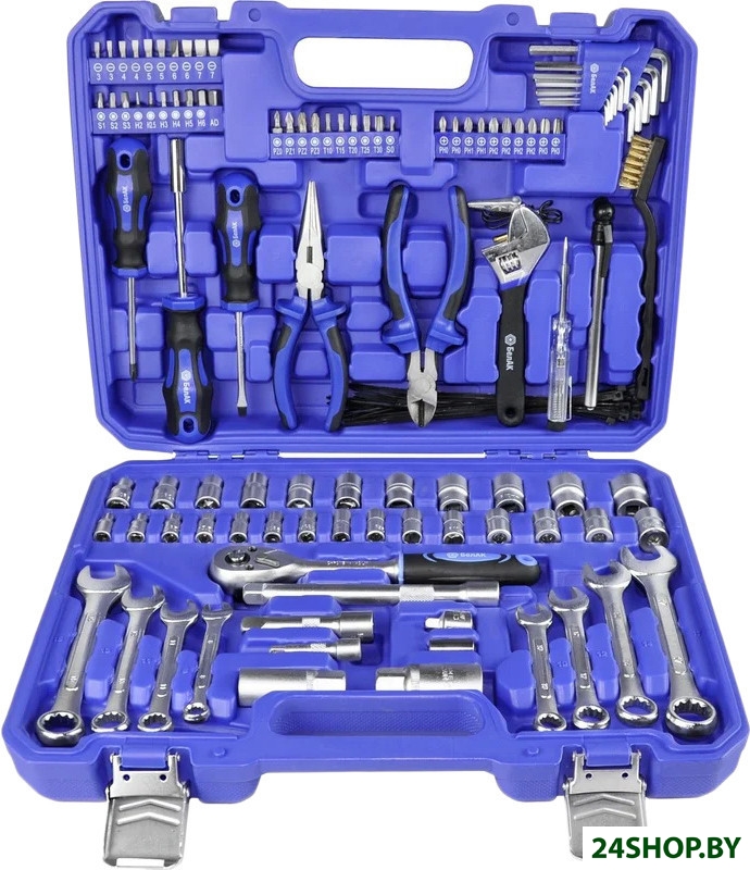 - Комплектация: - 1/4" Головки торцевые: 4, 4.5, 5, 5.5, 6, 6.5, 7, 7.5, 8, 9, 10, 11, 12, 13, 14 мм- 1/4" Адаптер- 1/4" Удлинитель- 3/8" Головки торцевые: 8, 9, 10, 11, 12, 13, 14, 15, 16, 17, 19 мм- 3/8" Головки торцевые свечные: 16, 21 мм- 3/8" Ключ трещоточный- 3/8" Удлинитель 2 шт.- 3/8" Адаптер- Биты 25 мм: SL3х2, SL4x2, SL5x2, SL6x2, SL7x2, PН0x2, РН1x2, РН2x4, РНЗx2, РZО, РZ1, РZ2, РZ3, Т10, Т15, Т20, Т25, Т30, S0, S1, S2, S3, АD, Н2, Н2.5, НЗ, Н4, H5, Н6- Комплект шестигранных ключей: 1.27, 1.5, 2, 2.5, 3, 3.5, 4, 4.5, 5, 5.5, 6 мм- Комплект комбинированных ключей: 8, 10, 11, 12, 13, 14, 15, 17 мм- Индикаторная отвертка: 12-220 В- Отвертка битодержатель 150 мм- Отвертки: SL5x75 мм, РН1х75 мм- Хомуты 20 шт.: 200 мм- Щетка металлическая- Индикатор давления- Разводной ключ: 150 мм- Бокорезы 150 мм- Длинногубцы 150 мм- Кейс для хранения