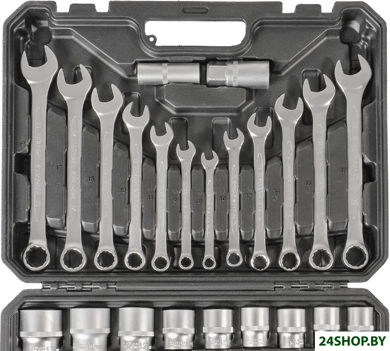 - Комплектация: Ключ комбинированный (12 шт) Головки 1/2" (19 шт) Головка торцевая свечная, 1/2" (2 шт) Шарнир карданный 1/2 (1 шт) Удлинитель 1/2":250 мм (1 шт) Адаптер 1/2” (1 шт) Ключ шестигранный (9 шт) Рукоятка с трещеткой квадрат 1/2 (1 шт) Кейс (1 шт)