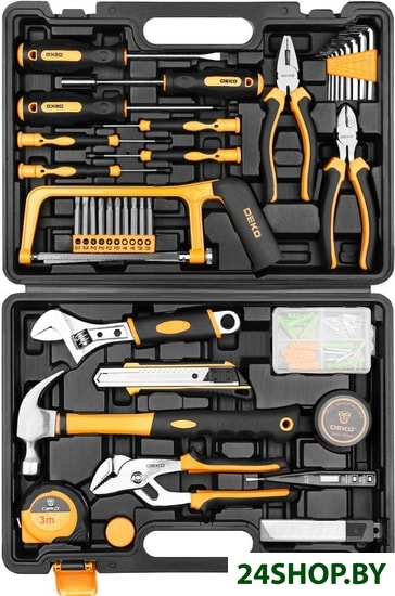 - Комплектация: - 2 шт. отвертка PH2x100, SL6x100мм,- 1 шт. держатель для бит 6.35мм,- 4 шт. претензионная отвертка,- 1 шт. пила 6", 10 шт. биты 50L,- 1 шт. плоскогубцы 6",- 1 шт. бокорезы 6",- 8 шт. шестигранный ключ 1.5-6мм,- 1 шт. разводной ключ 6",- 1 шт. строительный нож 18мм,- 10 шт. лезвия для ножа 18мм,- 1 шт. молоток,- 1 шт. переставной ключ 8",- 1 шт. измерительная летна 3м,- 1 шт. насадка на молоток,- 1 шт. изолента 5 м,- 1 шт. тестер напряжения 220В,- 54 шт. крепеж,- 2 шт. лезвие для пилы 6"