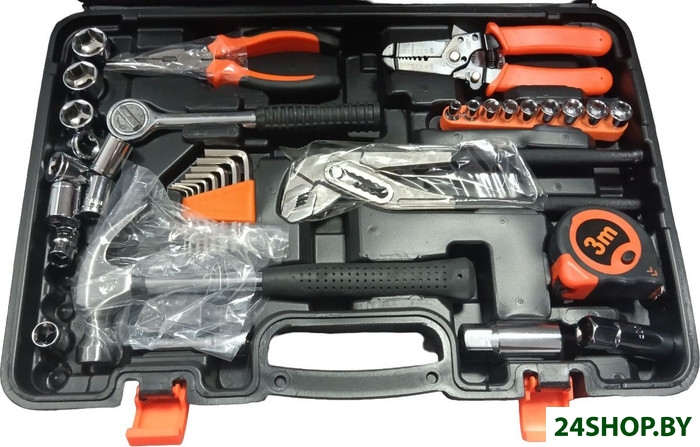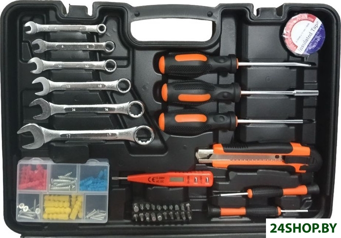 - Комплектация: Переставные клещи -1шт Длинногубцы 6" - 1штСтриппер для зачистки проводов -1штКомбинированный ключ -6 штНабор ключей шестигранников - 8штМолоток-1 штОтвертка 2штНабор отверток для точечных работ 2 штИндикаторная отвертка -пробник 1штИзолента 1штРулетка 3м-1штМонтажный нож-1штТорцевые головки 1/4-9штГоловка торцевая свечная 3/8 16мм-1штГоловка торцевая свечная 3/8 21мм-1штУдлинитель 3/8" 75мм-1штТрещотка 3/8"-1штТорцевые головки 3/8-10штОтвертка-битодержатель -1штНабор бит 25мм 9штБита - адаптер для торцевых головок 1штНабор бит 50мм 10штНабор крепежа 1штКейс 1шт