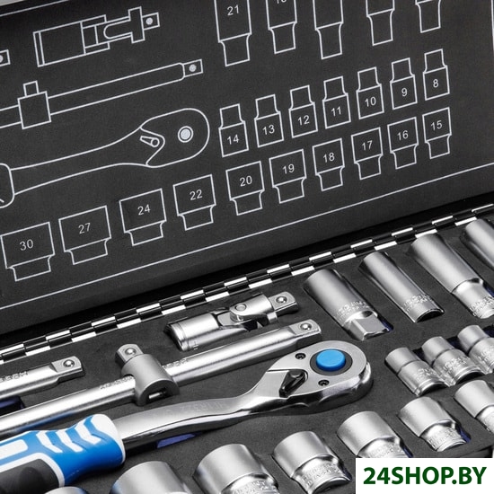 - Комплектация: - Головки торцевые 1/2’’: 8, 9, 10, 11, 12, 13, 14, 15, 16, 17, 18, 19, 21, 22, 24, 27, 30, 32, 34 мм- Головки длинные 1/2’’: 15, 17, 19 мм- Торцевые головки для свечей 1/2": 16, 21 мм- Удлинитель 1/2": 125, 250 мм- Универсальный шарнир 1/2"- Переходник M1/2”-F3/8”- Трещотка 1/2"