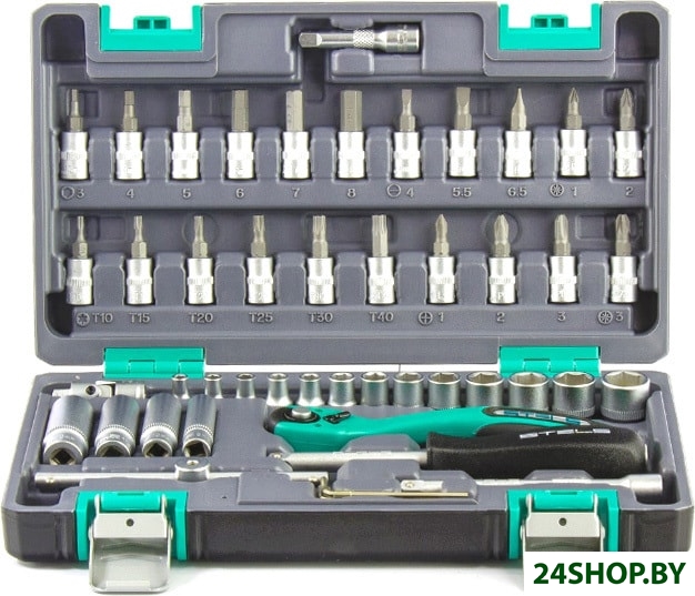 - Комплектация: - Ключ трещоточный 1/4.- Головки торцевые 1/4: 4, 4.5, 5, 5.5, 6, 7, 8, 9, 10, 11, 12, 13, 14.- Головки торцевые 1/4 удлиненные 8, 10, 11, 13.- Кардан 1/4.- Удлинитель 1/4.- Отвертка-держатель 1/4.- Комплект шестигранных ключей 1.5 мм, 2.0 мм, 2.5 мм.- Вороток Т-образный 1/4- Головки торцевые 1/4" со вставкой Т10, Т15, Т20, Т25, Т30, T40, SL4, SL5.5, SL6.5, PH1, PH2, PH3, PZ1, PZ2, PZ3, H3, H4, H5, H6, H7, H8.