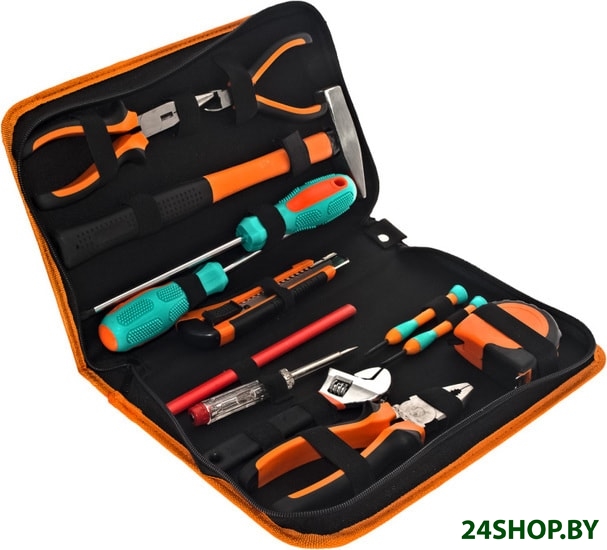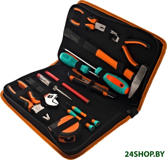 - Комплектация: 2 отвертки для точных работ, 2 отвертки PH2*150, SL6*150, разводной ключ 6", 1 шт комбинированные плоскогубцы - 7" , 1 шт мини бокорезы, 1 шт длинногубцы 6", 1 шт нож 1 шт молоток,200 гр., 1 шт тестер напряжения, рулетка 3 м, 1 шт - карандаш.