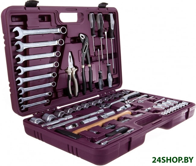 - Комплектация: 1/4" DRГоловки торцевые, 9 шт. 4, 5, 6, 7, 8, 9, 10, 11, 12 мм;Головки торцевые глубокие, 4 шт. 8, 10, 12, 13 мм;Трещоточная рукоятка;Вороток Т-образный;Шарнир карданный;Удлинитель 75 мм;Гибкий удлинитель 150 мм;Отверточная рукоятка;Адаптер для вставок-бит 1/4"DR х 1/4"НDR;Вставки-биты 1/4"НDR, L=25 мм, 18 шт. (PH) 1, 2, 3; (H) 3, 4, 5, 6; (SL) 3, 4, 5, 6; (T) T10, T15, T20, T25, T27, T30, T40;1/2" DRГоловки торцевые, 13 шт. 12, 13, 14, 15, 17, 18, 19, 21, 22, 24, 27, 30, 32 мм;Головки свечные, 2 шт. 16, 21 мм;Трещоточная рукоятка;Шарнир карданный;Удлинители, 2 шт. 125, 250 мм;Адаптер трехсторонний;Ключи торцевые шестигранные, 3 шт. 1.5, 2, 3 мм;Ключи комбинированные, 8 шт. 8, 10, 12, 13, 14, 15, 17, 19 мм;Молоток 0,3 кг;Пассатижи 175 мм;Клещи переставные 250 мм;Отвертки, 5 шт. (PH) 1х75 мм, 2х100 мм, 3х150 мм; (SL) 4х100 мм, 6х150 мм;Кейс.