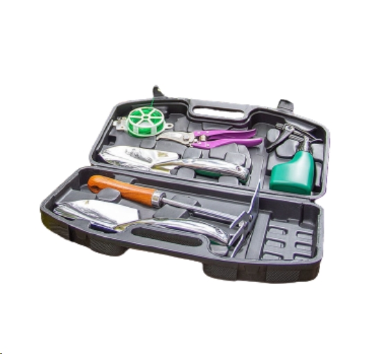 Включает две лопатки разного размера для посадки и пересадки растений, рыхлитель для почвы, секатор для подстригания стеблей и небольших веток, проволоку с режущим инструментом и опрыскиватель.