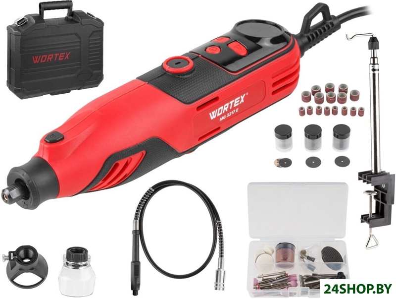 - Комплектация: - Гравер электрический - 1 шт.;- Гибкий вал - 1 шт.;- Штатив со струбциной - 1 шт.;- Защитный кожух - 1 шт.;- Насадка для фрезерования - 1 шт.;- Быстрозажимной патрон (1-3.2 мм) - 1 шт.;- Комбинированный ключ - 1 шт.;- Г-образный ключ для фиксации гибкого вала - 1 шт.;- Комплект угольных щеток - 1 шт.;- Аксессуары и оснастка для резки, шлифовки, полировки и другой обработки - 175 шт.- Инструкция - 1 шт.- Кейс - 1 шт.