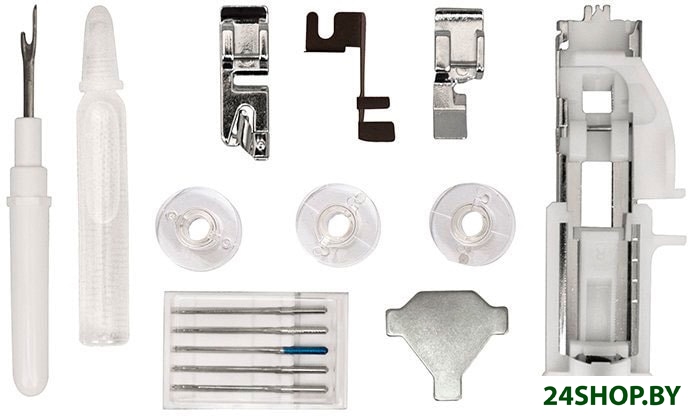 - Лапки: универсальная, для вшивания молнии, для обметывания петель, для подрубки