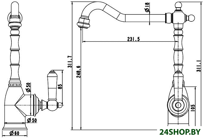 - Длина (вылет) излива: 231.5 мм