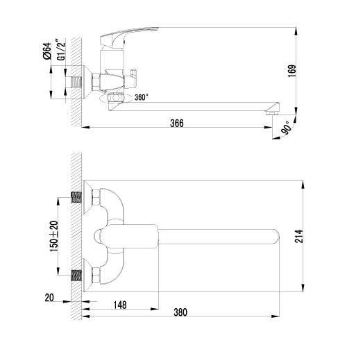 - Длина (вылет) излива: 366 мм