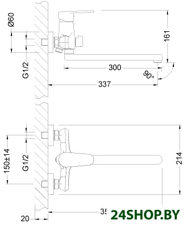 - Длина (вылет) излива: 337 мм