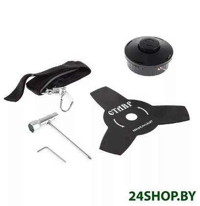 - Аксессуары: катушка с леской, нож, ключ шестигранный, ключ гаечный 8x10, комплект крепежа, наплечный ремен