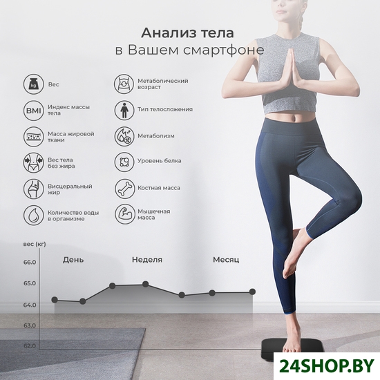 - Функциональные особенности: расчет доли воды, расчет доли жировой ткани, расчет доли мышечной ткани, расчет доли костной ткани, расчет ИМТ (BMI), расчет ПБМ (BMR), расчет уровня белка, расчет метаболического возраста