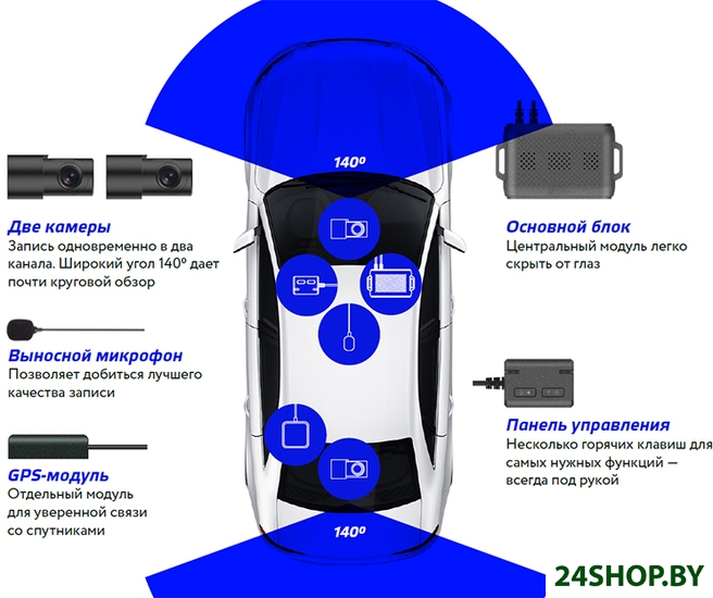 - Комплектация: - Главный блок видеорегистратора- Панель управления с кабелем питания- Внешний GPS-модуль- Микрофон- Основная камера и камера заднего вида- USB-картридер- Инструкция- Гарантийный талон