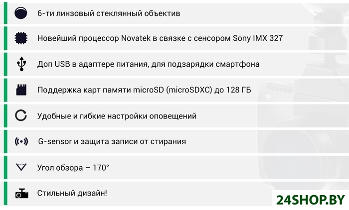- Комплектация: - видеорегистратор;- поляризационный фильтр (CPL);- крепление на присоске;- доп. крепление на 3М скотче;- автомобильное зарядное устройство;- салфетка для линзы и экрана.