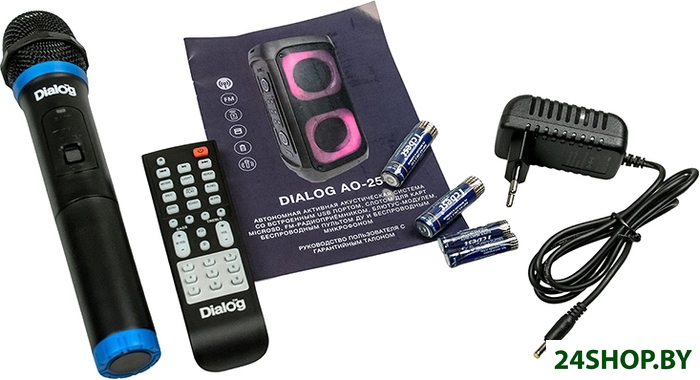 - Комплектация: - пульт ДУ- батарейки для пульта ДУ (2xAAA)- беспроводной микрофон- батарейки для микрофона (2xAA)- адаптер питания- съемный ремешок- документация