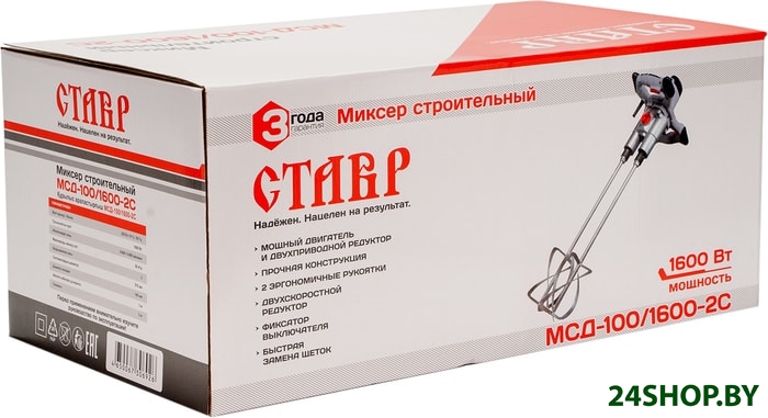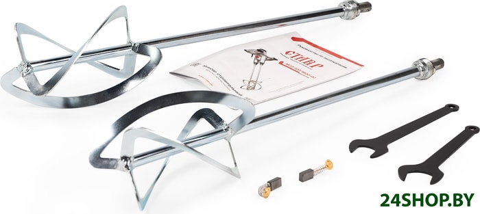 - Комплектация: - Руководство по эксплуатации 1 шт.- Миксер строительный 1 шт.- Ключ рожковый 2 шт.- Лопасть 2 шт.- Угольные щетки (запасной комплект) 1 шт.