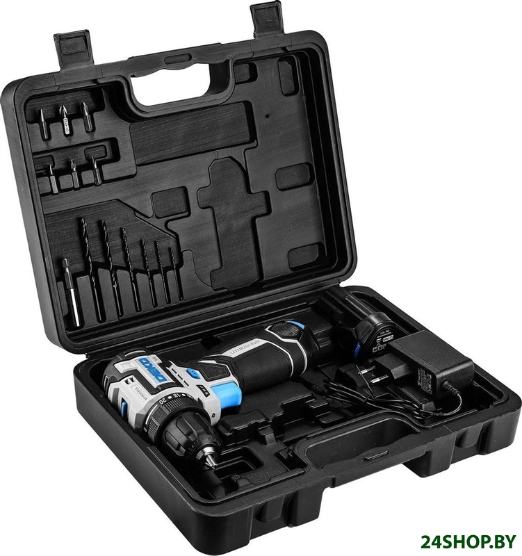 - Комплектация: - Дрель-шуруповерт аккумуляторная, - АКБ - 2 шт., - зарядное устройство, - бита, - руководство по эксплуатации, - кейс.