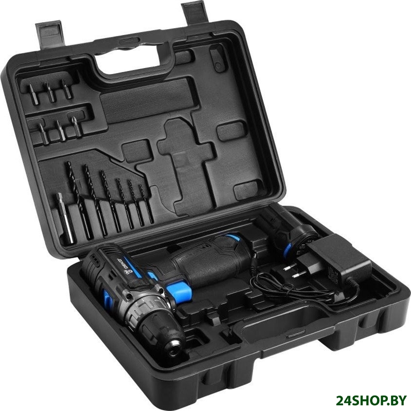 - Комплектация: - Дрель-шуруповерт - 1 шт.- Аккумулятор 3,0 Ач - 2 шт.- Зарядное устройство - 1 шт.- Сверла: 2, 2.5, 3, 4, 5, 6 мм - 6 шт.- Биты: SL4, SL6, PH1, PH2, PZ1, PZ2 - 6 шт.- Удлинитель для бит - 1 шт.- Инструкция- Кейс