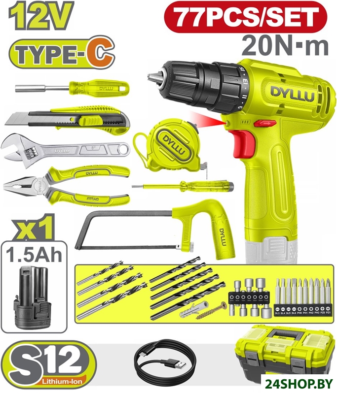 - Комплектация: - Дрель-шуруповерт DYLLU DTCDS518 - 1 шт.- Аккумулятор 1.5 Ач - 1 шт.- Кабель – USB Type-A → Type-C- Магнитный держатель – 1/4" × 100 мм- Биты 2" – SL4, SL5, SL6, PH1, PH2, PH3, T10, T15, T20, T30- Комбинированные плоскогубцы – 6"- Разводной ключ – 6"- Индикаторная отвертка – 140 мм- Рулетка – 3 м- Нож с сигментным лезвием – 18 мм- Спиральные сверла – 2, 3, 4, 5, 6 мм- Сверла по дереву – 4, 5, 6, 8 мм- Торцевые головки – 5, 6, 7, 8, 9, 10, 11 мм- Винты – ST3.5 – 10 шт., ST4 – 10 шт.- Пластиковые дюбели – 6 мм – 10 шт., 5 мм – 10 шт.- Рамка для ножовки – 6"- Ящик для инструментов – пластиковый 16"