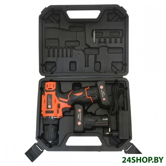 - Комплектация: - Дрель-шуруповерт 1- Аккумуляторная батарея 2- Зарядное устройство 1- Руководство по эксплуатации 1- Бита 1- Кейс пластиковый 1