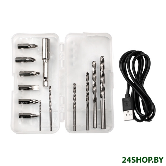 - Комплектация: - Дрель-шуруповерт аккумуляторная 1 шт. - Руководство по эксплуатации 1 шт. - Кабель зарядки USB 1 шт.- Сверло 6 шт.- Бита 6 шт.- Переходник для бит 1 шт.- Кейс