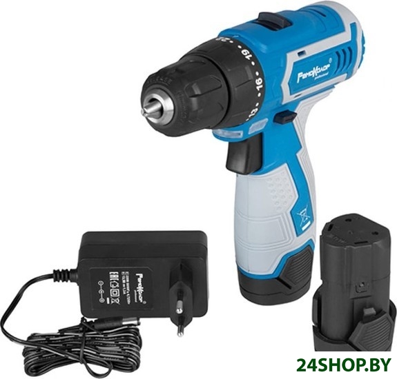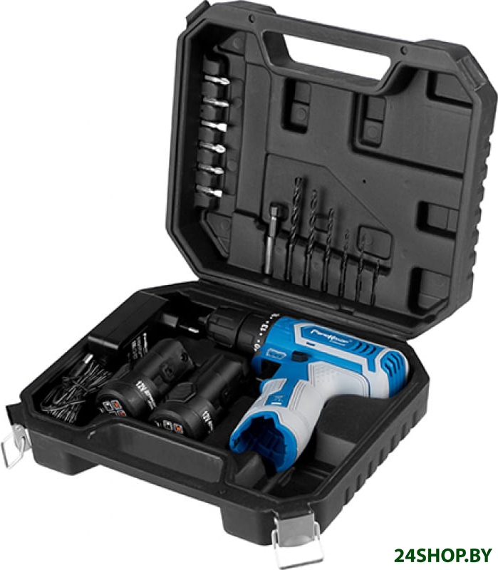 - Комплектация: - Дрель-шуруповерт- Аккумулятор – 2 шт.- Зарядное устройство- Бит насадки – 6 шт.- Сверла – 6 шт.- Держатель магнитный для бит- Кейс