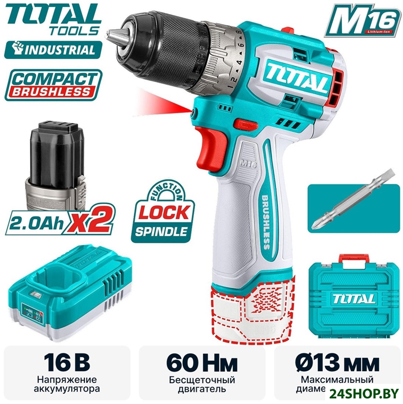 - Комплектация: - Бесщеточная дрель-шуруповерт - 1 шт.- Аккумулятор 2,0 Ач TFBLI1620 - 2 шт.- Зарядное устройство 1,3 А TFCLI1613 - 1 шт.- Двухсторонняя бита Cr-V 65 мм - 1 шт.- Инструкция- Коробка