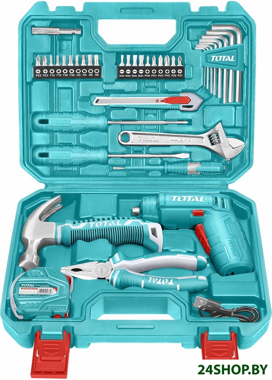 - Комплектация: - Отвертка аккумуляторная - 1 шт.- Отвертка SL5.5x100 - 1 шт.- Отвертка PH1x100 - 1 шт.- Комбинированные плоскогубцы 6" - 1 шт.- Разводной ключ 6" - 1 шт.- Мини-молоток - 1 шт.- Индикаторная отвертка (напряжение: 100-500 В переменного тока) - 1 шт.- Рулетка 3 м - 1 шт.- Нож с сегментным лезвием 9 мм - 1 шт.- Бита (SL3, SL4, SL5, SL6, PH0, PH1, PH2, PH3, PZ0, PZ1, PZ2, PZ3, T10, T15, T20, T30, H3, H4, H5, H6) - 20 шт.- Магнитный держатель для бит - 1 шт.- Шестигранный ключ (1,5/2/2,5/3/4/5/5,5/6 мм) - 8 шт.- Кейс