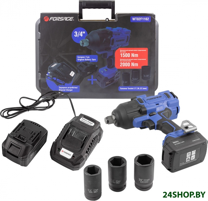 - Комплектация: - гайковерт- 2 АКБ- з/у- кейс- набор головок 27, 30, 32 мм