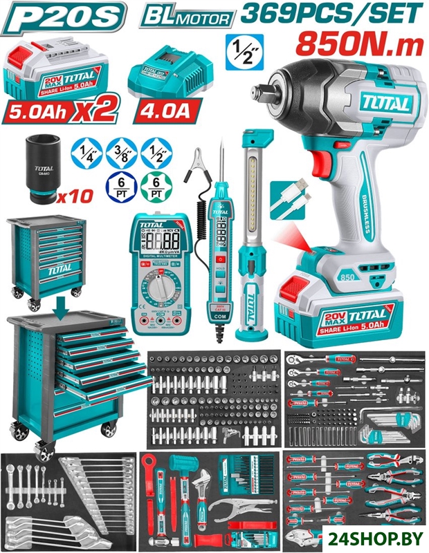 - Комплектация: Аккумуляторный инструмент и электроникаАккумуляторный ударный гайковёрт 20 В, 1/2" — 1 шт.Аккумулятор Li-ion 5.0 А·ч — 2 шт.Зарядное устройство 4 A — 1 шт.Ударные удлинённые головки 1/2" (10, 12, 13, 14, 15, 17, 19, 21, 22, 24 мм) — 10 шт.Аккумуляторный рабочий фонарь — 1 шт.Автомобильный тестер — 1 шт.Цифровой мультиметр — 1 шт.Инструментальная тележкаМеталлическая тележка с 7 ящиками — 1 шт.Колёса 5" — 2 шт.Металлические крючки для навесного инструмента — 5 шт.Инструмент 1/4"Трещотка 1/4"Головки 1/4"Удлинённые головки 1/4"TORX-головки 1/4"Удлинители 1/4"Гибкий удлинитель 1/4"Кардан 1/4"Вороток T-образный 1/4"Переходник 1/4"Магнитный держатель битДержатель бит 1/4"Бит-головки 1/4"Биты 6.35×25 ммИнструмент 3/8"Трещотка 3/8"Головки 3/8"Удлинённые головки 3/8"TORX-головки 3/8"Удлинители 3/8"Кардан 3/8"Переходник 3/8"Бит-головки 3/8"Инструмент 1/2"Трещотка 1/2"Головки 1/2"Удлинённые головки 1/2"TORX-головки 1/2"Свечные головки 1/2"Кардан 1/2"Удлинители 1/2"Вороток T-образный 1/2"Вороток L-образный 1/2"Бит-головки 1/2"Держатель бит 1/2"Переходник 1/2"БитыБиты 8×30 ммБиты 8×70 ммКлючиКомбинированные ключиКлючи для тормозных трубокОтогнутые накидные ключиШестигранные ключиTORX-ключиРазводной ключ 10"Ключ с фиксатором (lock wrench)Ключ масляного фильтраКлещи для масляного фильтраОтвёрткиСтандартные отвёрткиУсиленные отвёртки (go-thru)Плоскогубцы и зажимыПассатижи комбинированныеДлинногубцыБокорезыКлещи переставныеКлещи для стопорных колецУдарный и слесарный инструментМолоток без отдачи 2 lbМолоток шаровый 16 ozСъёмники обшивки — 5 шт.Экстракторы — 5 шт.Магнитный телескопический захватЗубила — 3 шт.Выколотки — 6 шт.Керны — 3 шт.